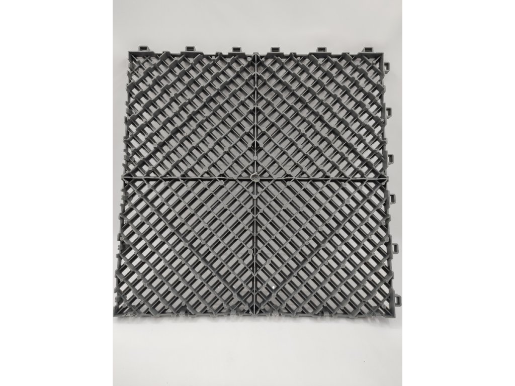 - Šedé plastové dlaždice o rozměrech 40 × 40 × 1,8 cm