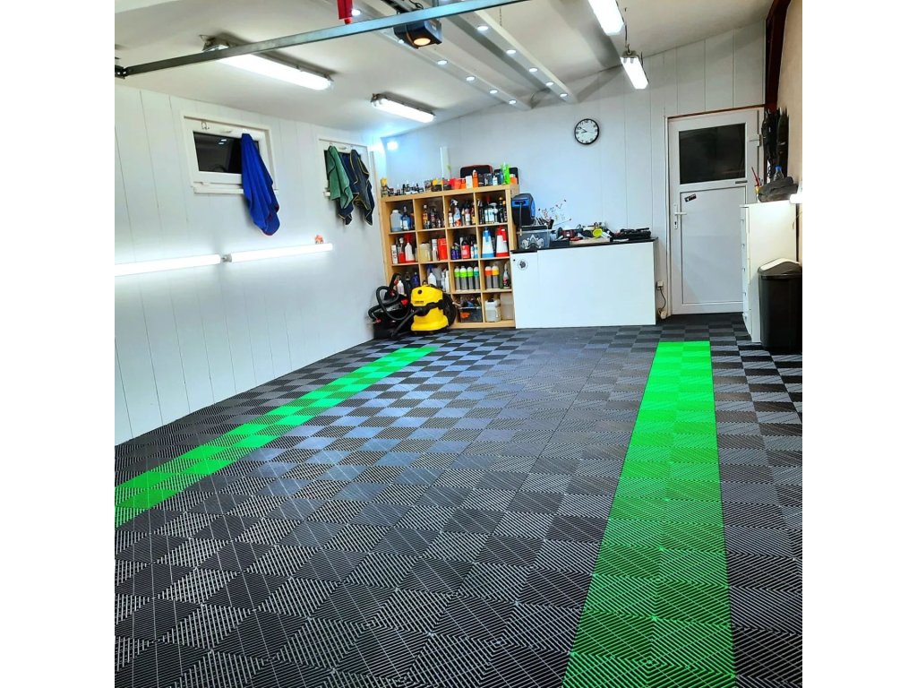 Zelené plastové dlaždice modulární podlahy. Získejte moderní a stylovou podlahu do své garáže nebo detailingového studia.