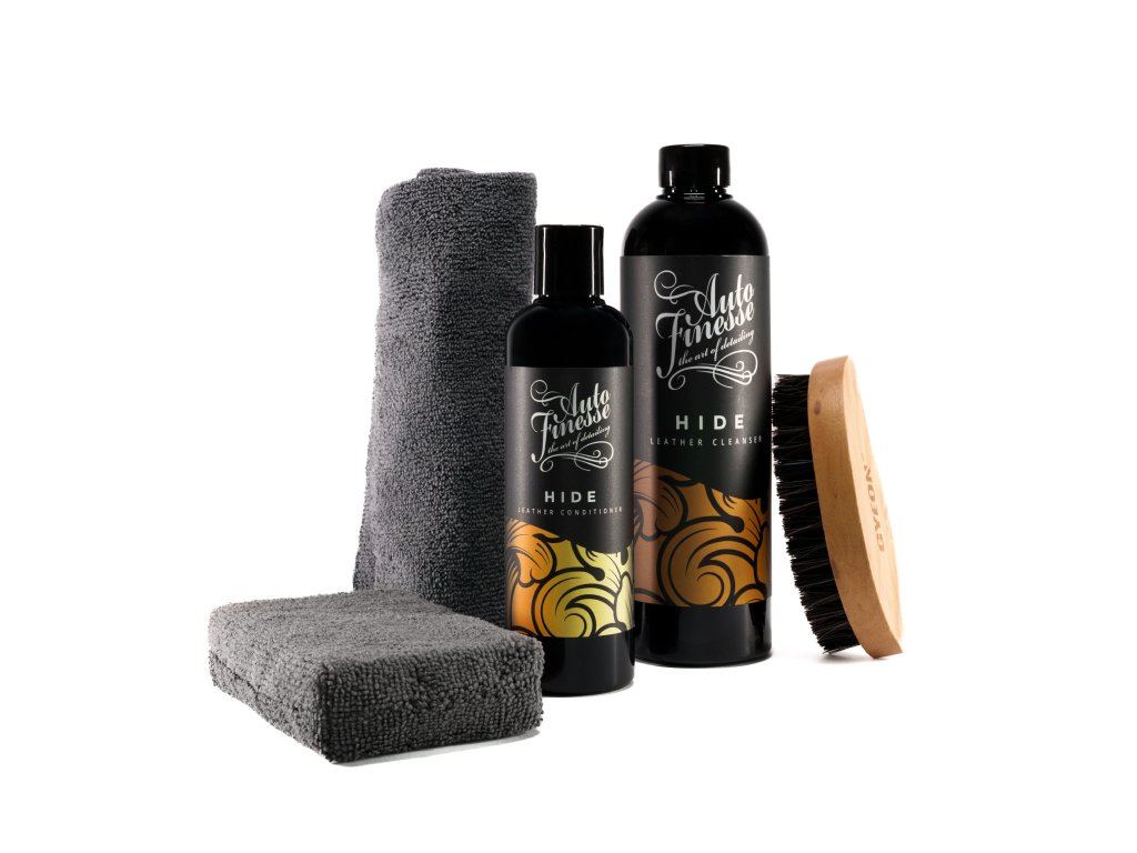 Auto Finesse Hide Leather Cleanser: Tento šetrný čistič pro kožený interiér důkladně odstraní nečistoty a mastnotu, zanechávaje povrch kůže bez šmouh. Jeho složení na bázi glycerinu zaručuje jemnou péči o vaše sedačky.